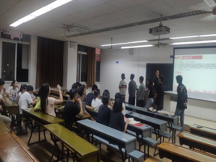 随后在党支部副书记韦鑫毅同志的主持下,新进的党员同志被分到各个党小组,并随后展开了迎新互动环节。第一个游戏是“你来比划我来猜”,首先各小组成员分别一字排开,并由第一位同志在规定的时间内记住一个词语和一个成语,然后用肢体语言向后面一位同学描述,依次传递,由最后一位同学根据描述来猜出具体的词语和成语,看哪一个组猜对的最多。第二个游戏是“名字接龙”,每个组内同志将自己的名字与周围人员互换,由主持人随机向其中的一位同志进行提问,并要求换到相应名字的人起来回答问题,当自己该回答而没有回答或者不该自己回答而抢答时就要被淘汰,同时3秒内没有做出任何反应的人同样被淘汰,每个小组回答完5个问题后组内剩余人数最多的获胜。大家都积极参与到了本次游戏中,在游戏中增进了组员之间的感情,加深了支部同志间的情谊。