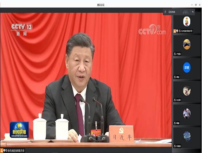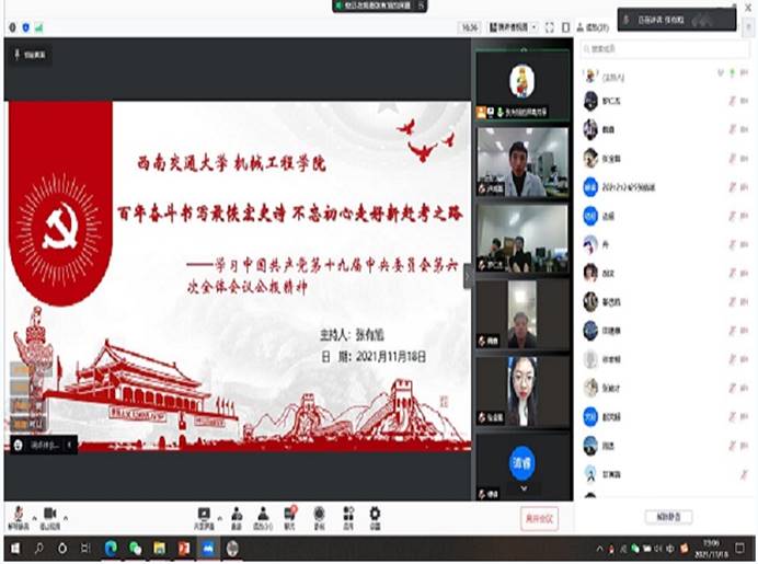研究生之窗讯(记者 樊翔翔 报道 卢旭磊 摄影)1118日下午19时,机械学院硕士第四党支部组织全体党员在线上以视频会议的形式开展十九届六中全会公报学习会。此次学习会是为了深入学习贯彻党的十九届六中全会精神,回顾党的百年奋斗历程,激励党员同志们传承伟大建党精神,矢志民族复兴的伟大事业。本次学习会由党支部书记张有旭同志组织开展。
