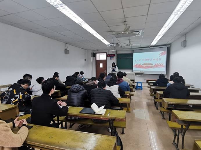 会议第二项,预备党员宣读转正申请书,刘哲、董思辰、杨晨昊和曾湄四位同志就近一年来在预备期间的基本情况作详细汇报。