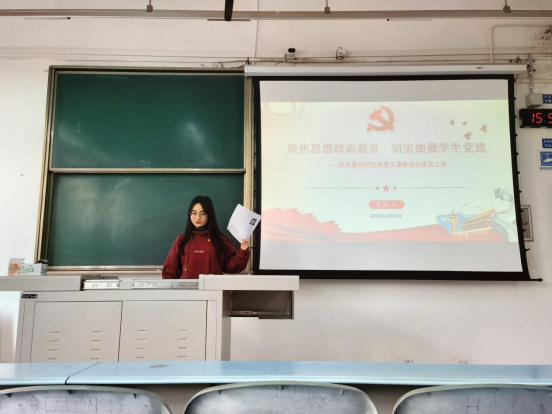 会上,党支部书记贾西贝同志代表党支部委员会作了工作报告,通报了党支部委员会查摆问题情况。贾西贝同志从教育党员、管理党员、监督党员、组织师生、服务师生、宣传师生及围绕中心大局等方面详细介绍了支部近一年来的工作情况。支部年度发展、毕业共计64名党员,联系团支部23个,现有党员40人,其中正式党员8人。贾西贝同志表示:“2021年,支部坚持履行好教育、管理、监督党员的基本职责,扎实开展党史学习主题教育,共组织或参与33次学习和会议,发挥凝聚、组织、宣传、服务师生作用,立足学习本业,力争建设为机械学院学生党支部的‘排头兵’”。