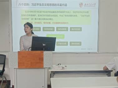 首先,由人文学院刘心睿进行生态文明建设专题的宣讲,题目为《大道笃行系苍生,“美丽中国”远必至》。在此过程中,刘心睿同志详细介绍了生态文明建设在治国理政中的重要作用,并进行了案例分享。这些内容直观地展示了中国这些年来的生态环境变化,彰显了党中央在推动生态文明建设过程中取得的重大进展。