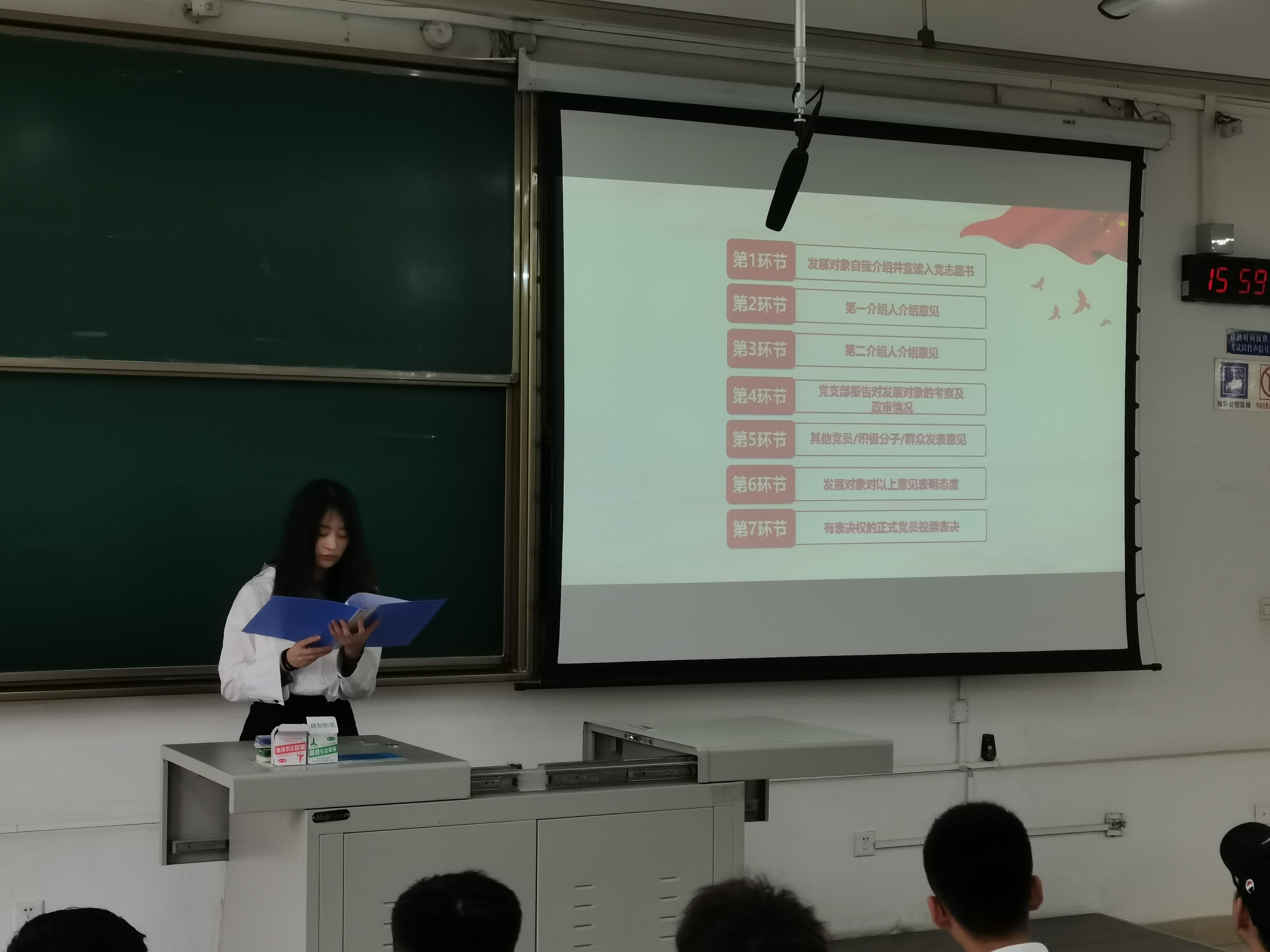 首先由陈菲儿同志上台做自我介绍,并宣读《入党志愿书》,与会党员发表意见,提出的意见表明态度,有表决权的党员填写表决票。陈菲儿等19名同志依次顺序进行宣读入党申请书。