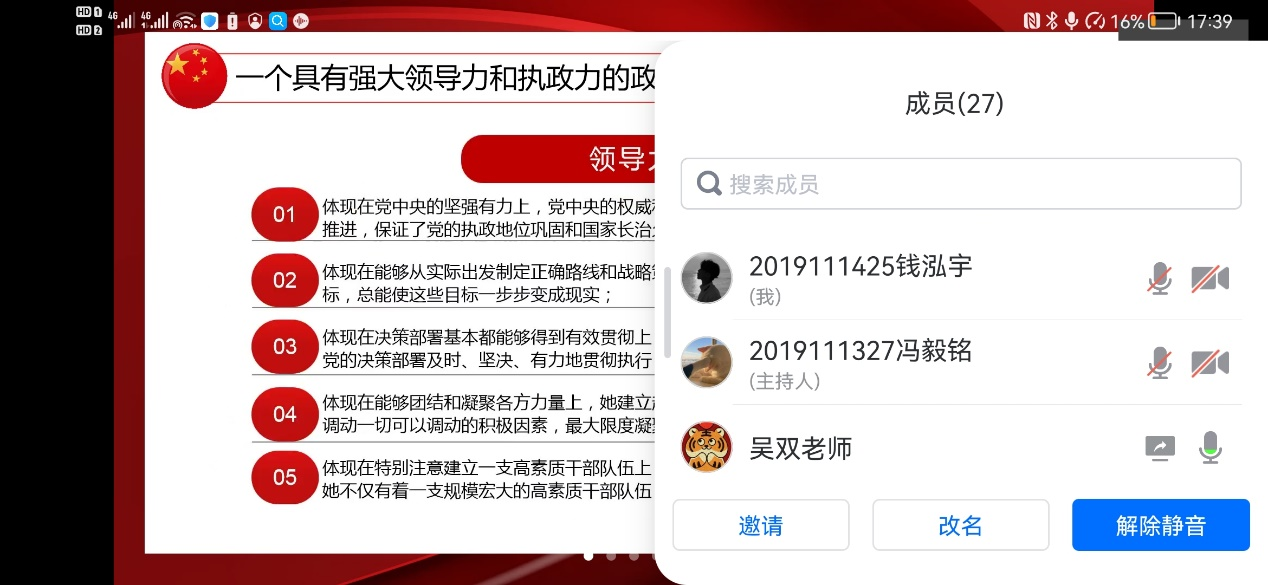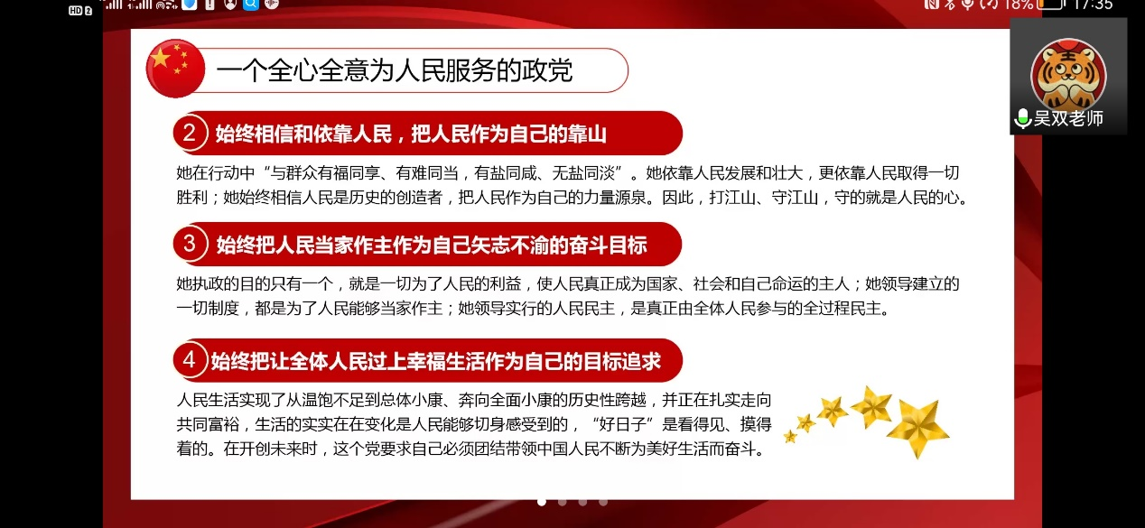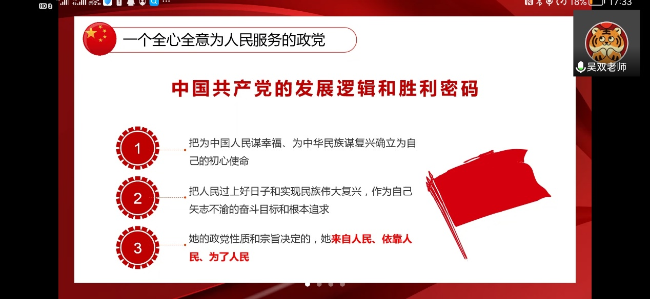 随后,吴老师从三个部分深入浅出的给出了自己的答案,中国共产党是一个全心全意为人民服务的政党、一个具有强大领导力和执政力的政党、一个为实现理想不懈奋斗的政党、一个始终保持旺盛生机和活力的政党。