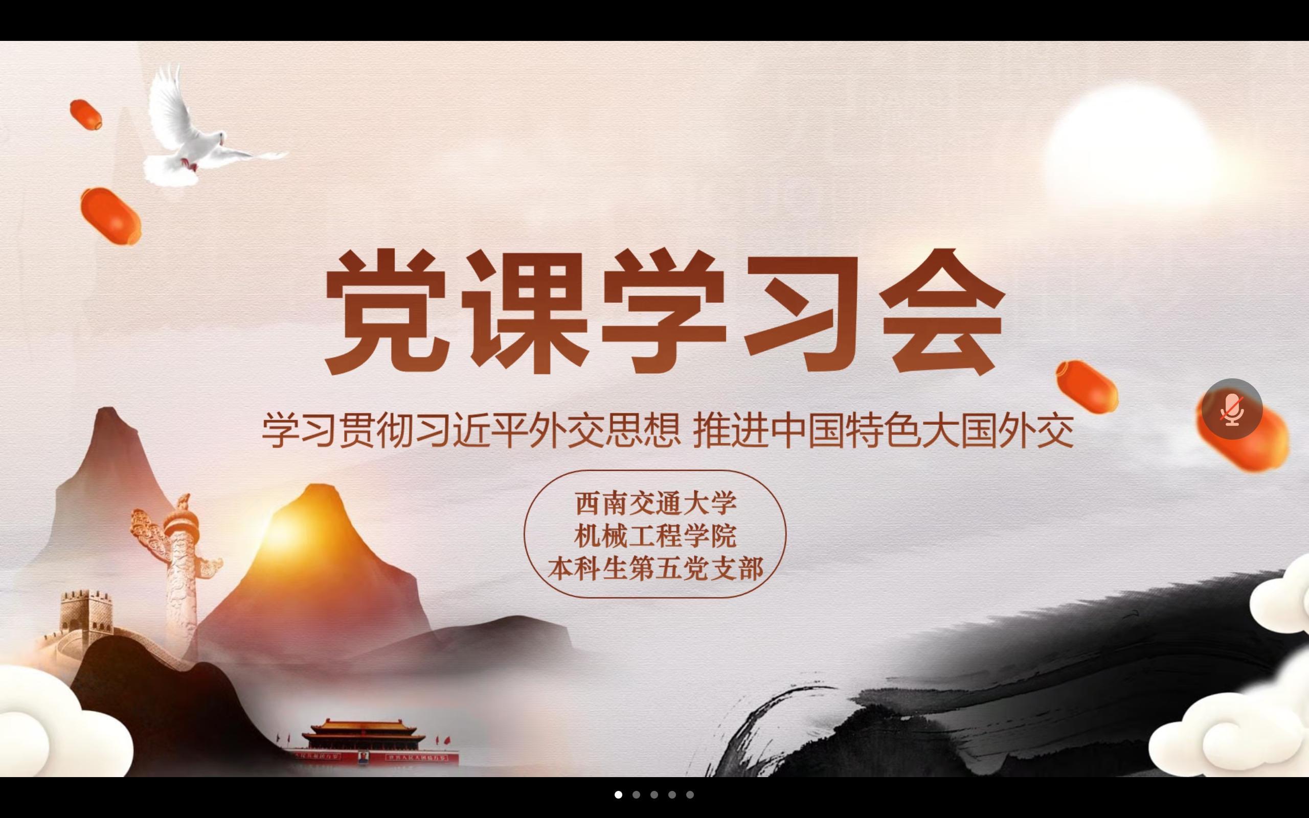 2022年11月24日下午16点,云博电子·(中国)网站本科学生第五党支部会议在腾讯会议上召开,戎昱同志担任本次大会的主持人。本次会议旨在学习《党课开讲啦》系列节目第一期,主题为“学习贯彻习近平外交思想,推进中国特色大国外交”。