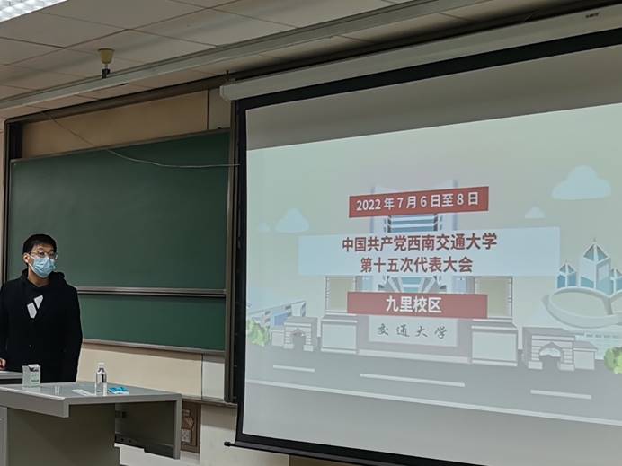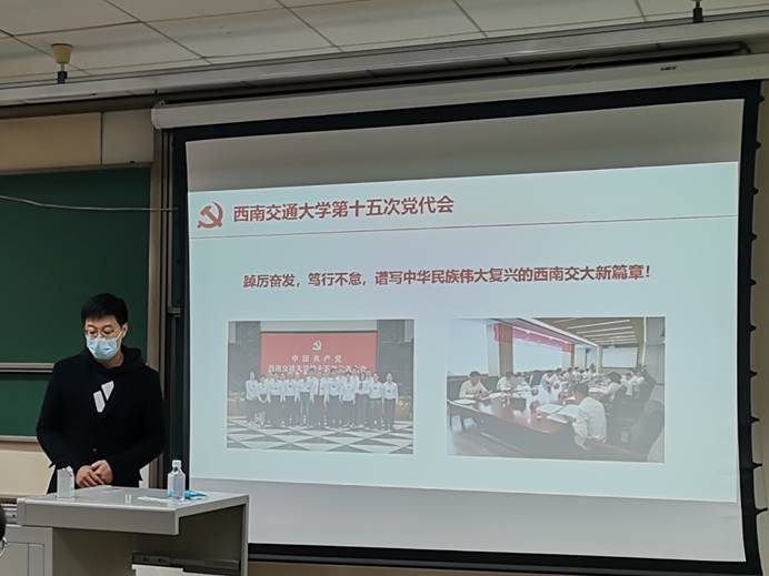 杨露同志带领与会同志一起学习了学校第十五次党代会宣讲视频,并结合作为学生代表参与学校第十五次党代会的经历分享了自己的学习感悟。西南交通大学第十五次党代会的主题是:高举习近平新时代中国特色社会主义思想伟大旗帜,深入贯彻落实习近平总书记关于教育的重要论述,全面总结成绩与不足,把握学校现阶段面临的主要矛盾,明确学校新时代的办学思路、发展目标、基本准则、实现途径。统一思想,凝聚共识,振奋精神,不断谱写中华民族伟大复兴的西南交大新篇章。