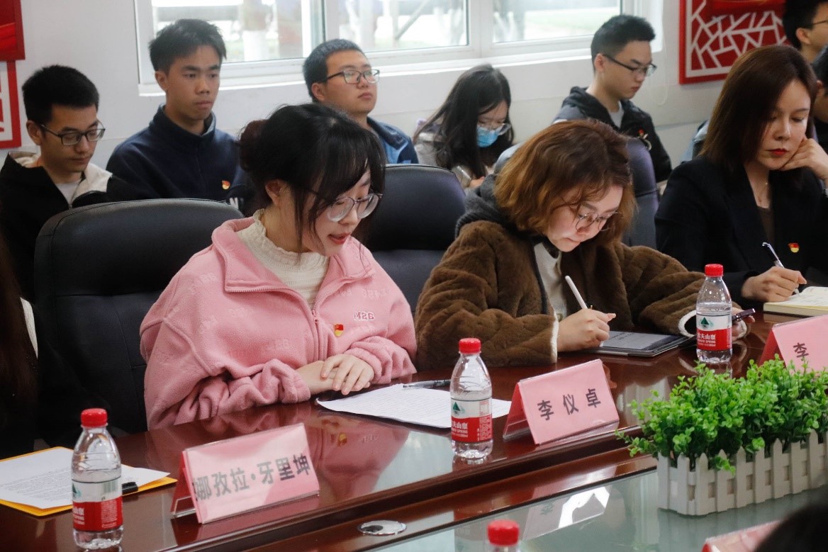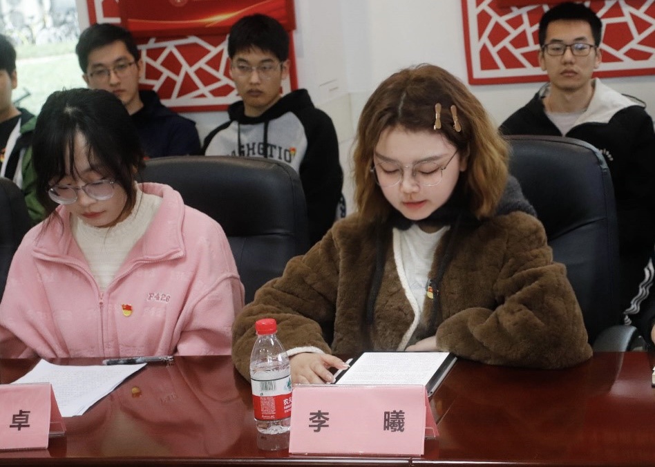 学生党员代表娜孜拉•牙里坤同志与李仪卓同志结合自身的生活、工作等经历,对这十年间所发生的伟大变革向大家分享了自己的想法;作为一名新疆人,娜孜拉•牙里坤在分享家乡十年变化的同时,她表示,如今的新疆社会稳定、经济发展、环境优美,与全国人民一道迈入全面小康社会的美好愿景之中,真正实现了新疆工作长治久安的总目标;李仪卓同志从我们每个新时代十年的亲历者的角度,向我们展示了十年来“我”与祖国共同跋涉、奋进发展的剪影,并表示:2023年是全面贯彻党的二十大精神的开局之年,广大青年要坚定不移听党话、跟党走,怀抱梦想又脚踏实地,敢想敢为又善作善成,立志做有理想、敢担当、能吃苦、肯奋斗的新时代的好青年。