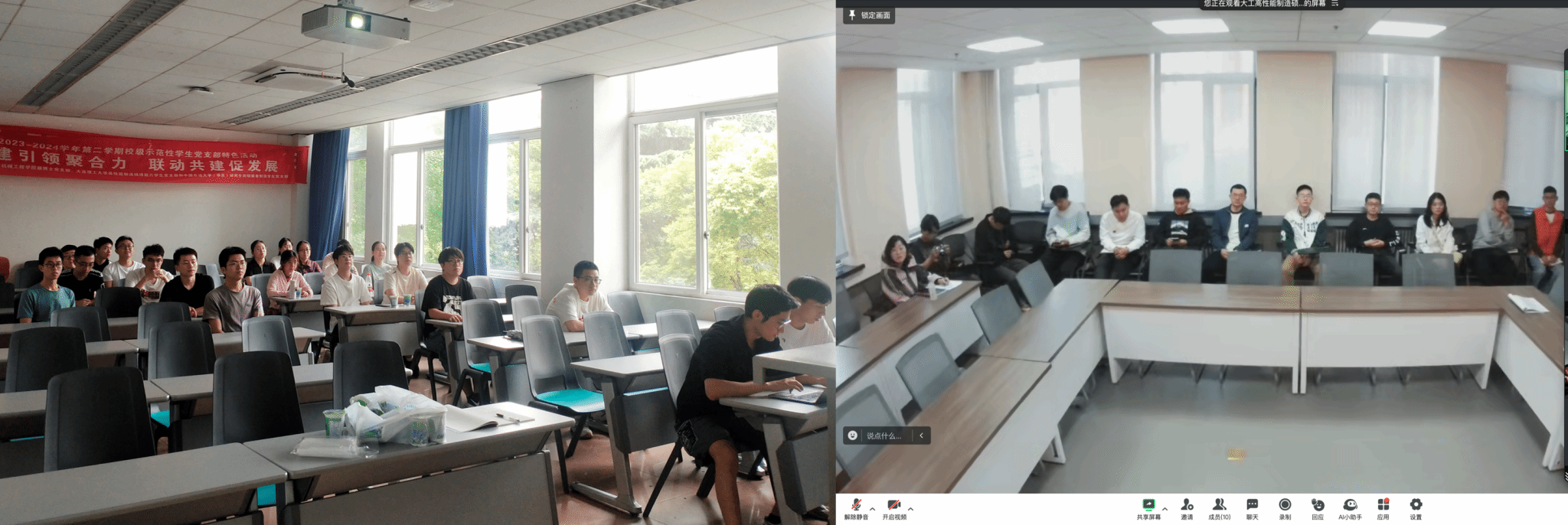 研究生之窗讯(记者 卢旭磊 摄影报道)5月24日下午,云博电子·(中国)网站23级博士党支部、大连理工大学高性能制造硕博第六学生党支部和中国石油大学(华东)机电工程学院研究生高端装备制造学生党支部联合召开党纪学习教育主题党日活动,通过线上(腾讯会议)+线下座谈形式,就党纪学习教育开展主题党日活动等事项进行交流学习。三方支部全体党员参加会议。卢旭磊同志主持会议。