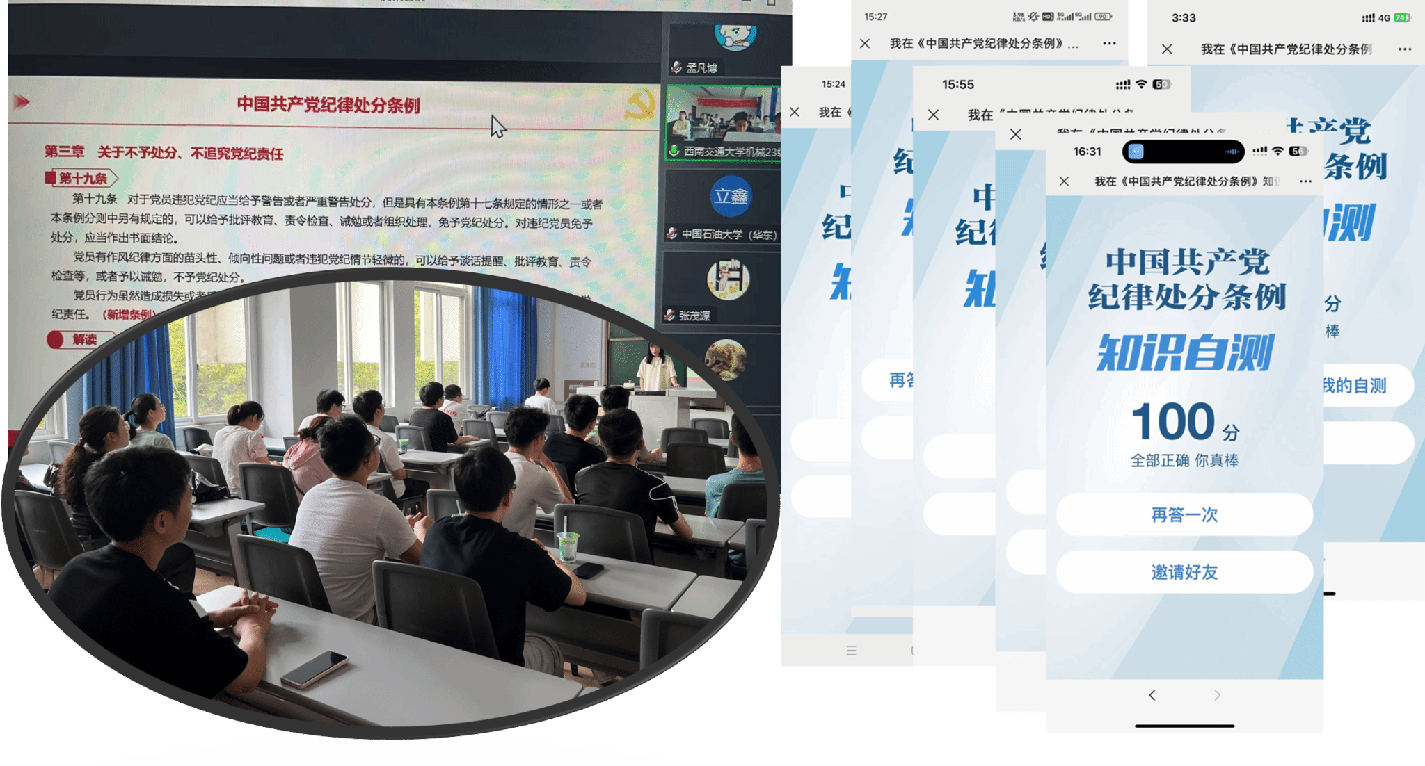 最后,大连理工大学高性能制造硕博第六学生党支部书记沈皓亮表示本次在学习过程中深刻体会到了《中国共产党纪律处分条例》的时代性和针对性,作为一名党员不仅仅要学习条例,遵守条例,更要以条例为对照,常怀律己之心,做到言行一致,表里如一,不断提高党性修养和纪律意识,争做一名忠诚、干净、有担当的合格共产党员。中国石油大学(华东)机电工程学院研究生高端装备制造学生党支部书记孟凡博对此表示高度赞同,表示作为学生党员更应时刻紧绷纪律这根弦,规范自己的一言一行,管住自己的一点一滴,将纪律规矩内化于心、外化于行,不断提高党性修养和纪律意识。