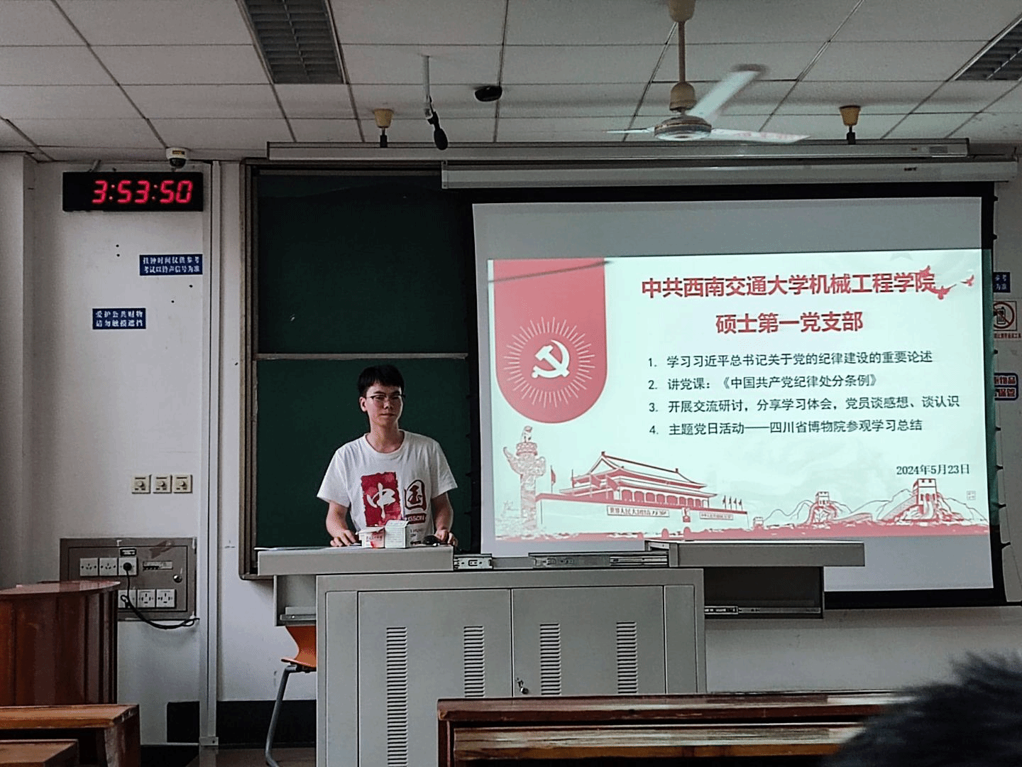 研究生之窗讯(记者 黎杰 摄影报道)2024年5月23日,云博电子·(中国)网站硕士第一党支部在九里校区4号教学楼J4322k开展主题党日活动。活动内容共四项:第一项:学习习近平总书记关于党的纪律建设的重要论述;第二项:支部书记讲党课——强化纪律意识,提升党性修养;第三项:开展交流研讨,分享学习体会,党员谈感想、谈认识;第四项:四川省博物院实地研学总结。本次会议由曾鸿同志主持。