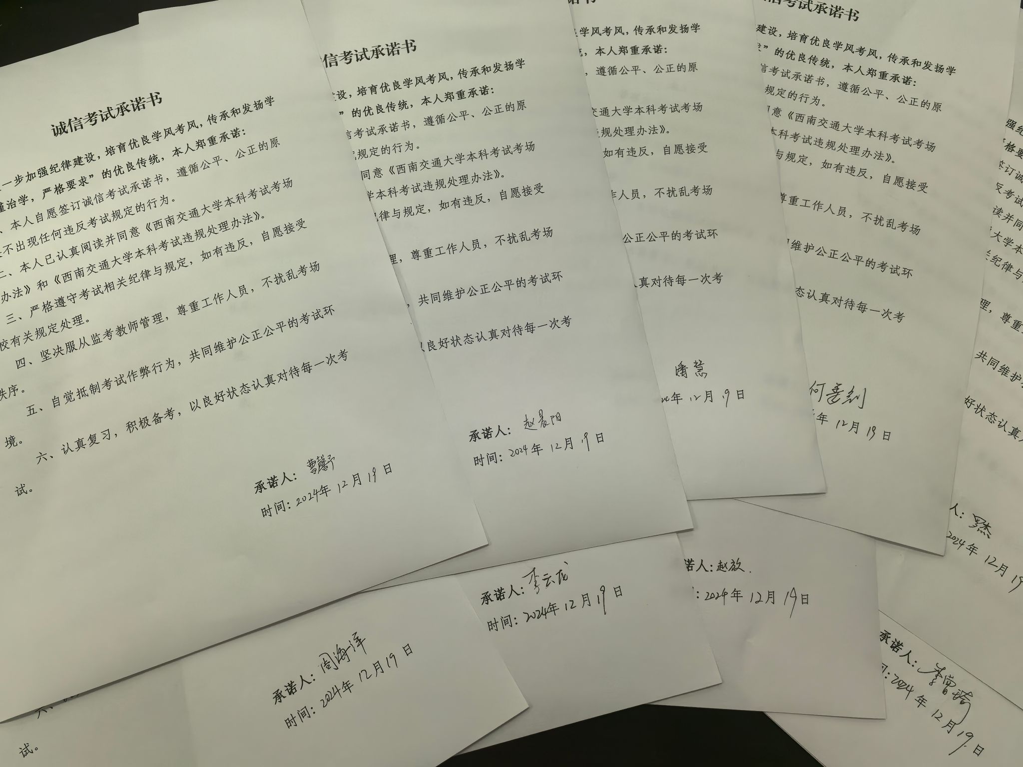 活动伊始,全体党员在现场共同签订《考试诚信承诺书》,由支部书记张翔老师带领大家学习《西南交通大学本科生考试违规处理办法》《西南交通大学本科考试考场管理办法》《西南交通大学学生纪律处分规定》等文件内容。此次承诺书签订以及文件学习不仅是对诚信考试的庄严承诺,更是对学生党组织和全体同学在学术道德方面的严格要求。通过此举,全体党员强化了诚信考试的责任感和使命感,展现了党员在学风建设中的先锋带头作用。