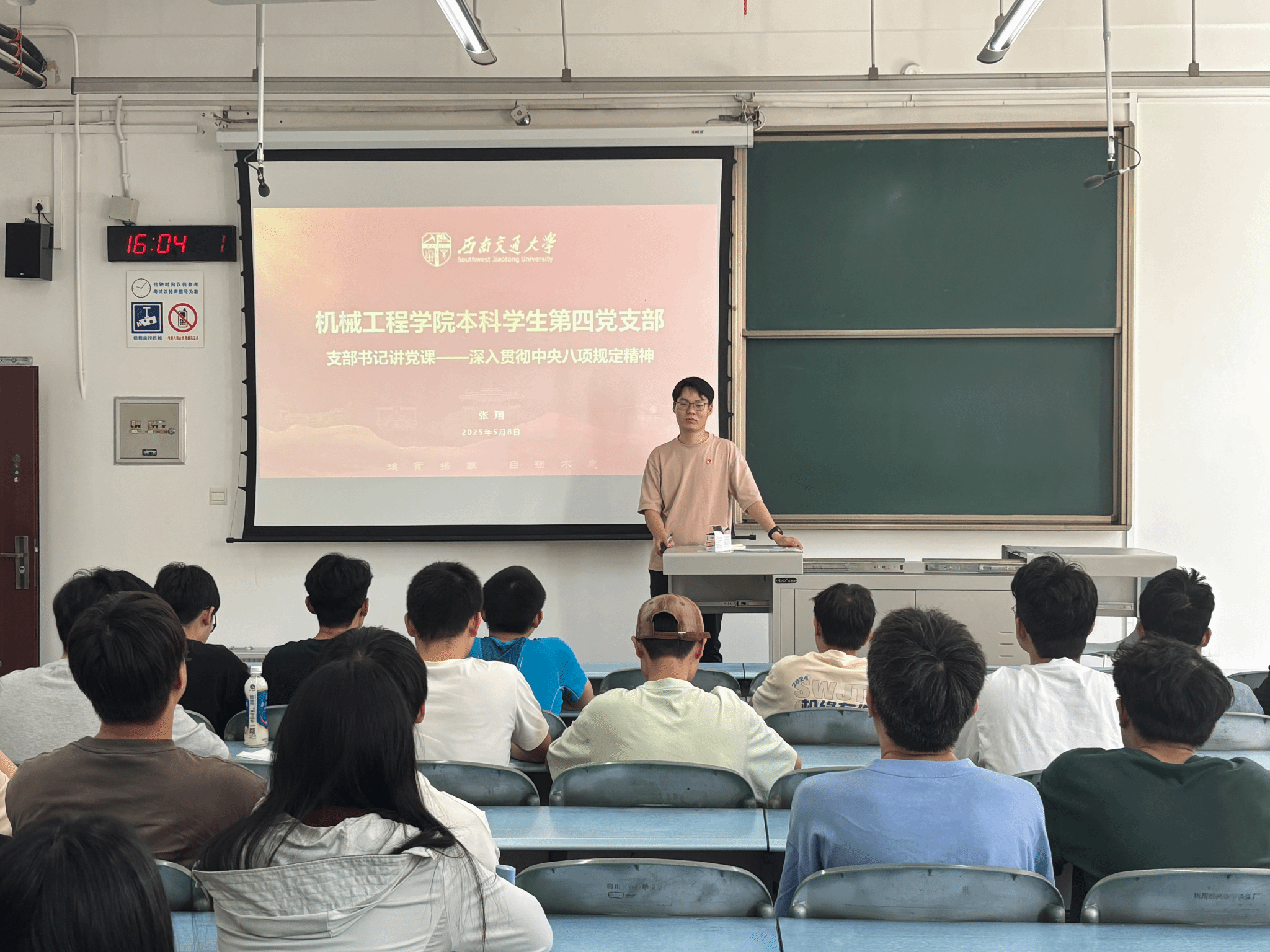 为深入学习贯彻习近平总书记关于加强党的作风建设的重要论述,扎实开展深入贯彻中央八项规定精神学习教育,推进作风建设常态化长效化,58日,本科学生第四党支部开展支部书记讲党课主题党日活动,支部书记张翔老师以“深入贯彻中央八项规定精神”为主题,为支部全体党员讲授了一堂作风建设党课。