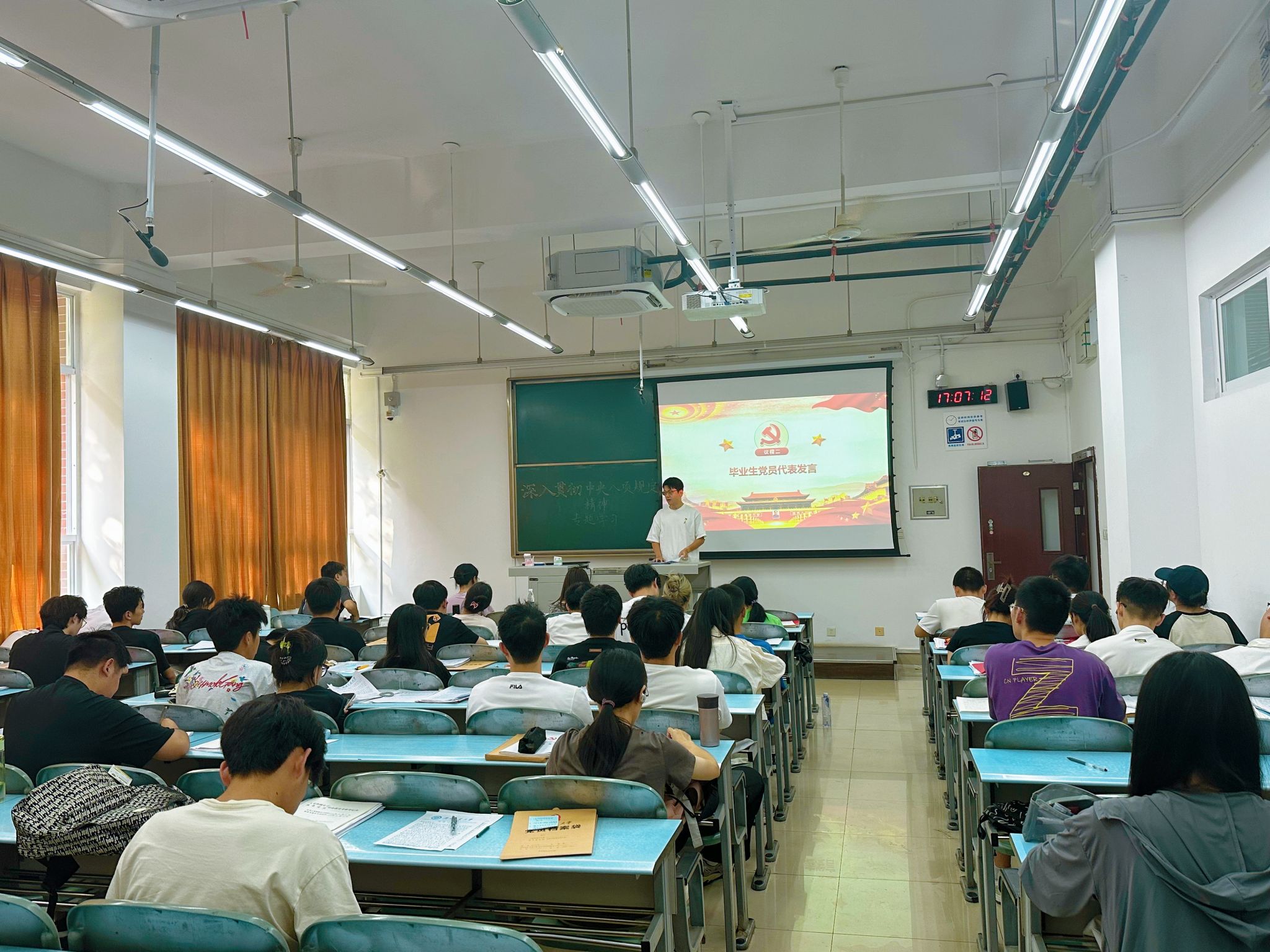 随后,毕业生党员代表吴骏秋在发言中回顾 “从普通学生到党员骨干” 的成长历程,以帮扶同学、参与志愿服务等事例诠释党员先锋模范作用,并代表全体毕业生党员表态:“将牢记听党话、跟党走的政治立场,把廉洁作为青春底色,在平凡岗位践行奉献精神。”