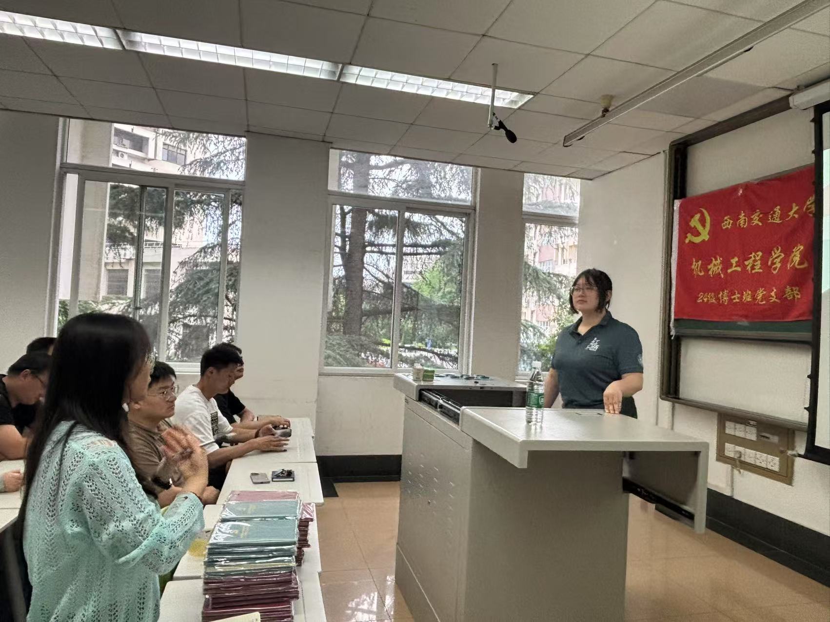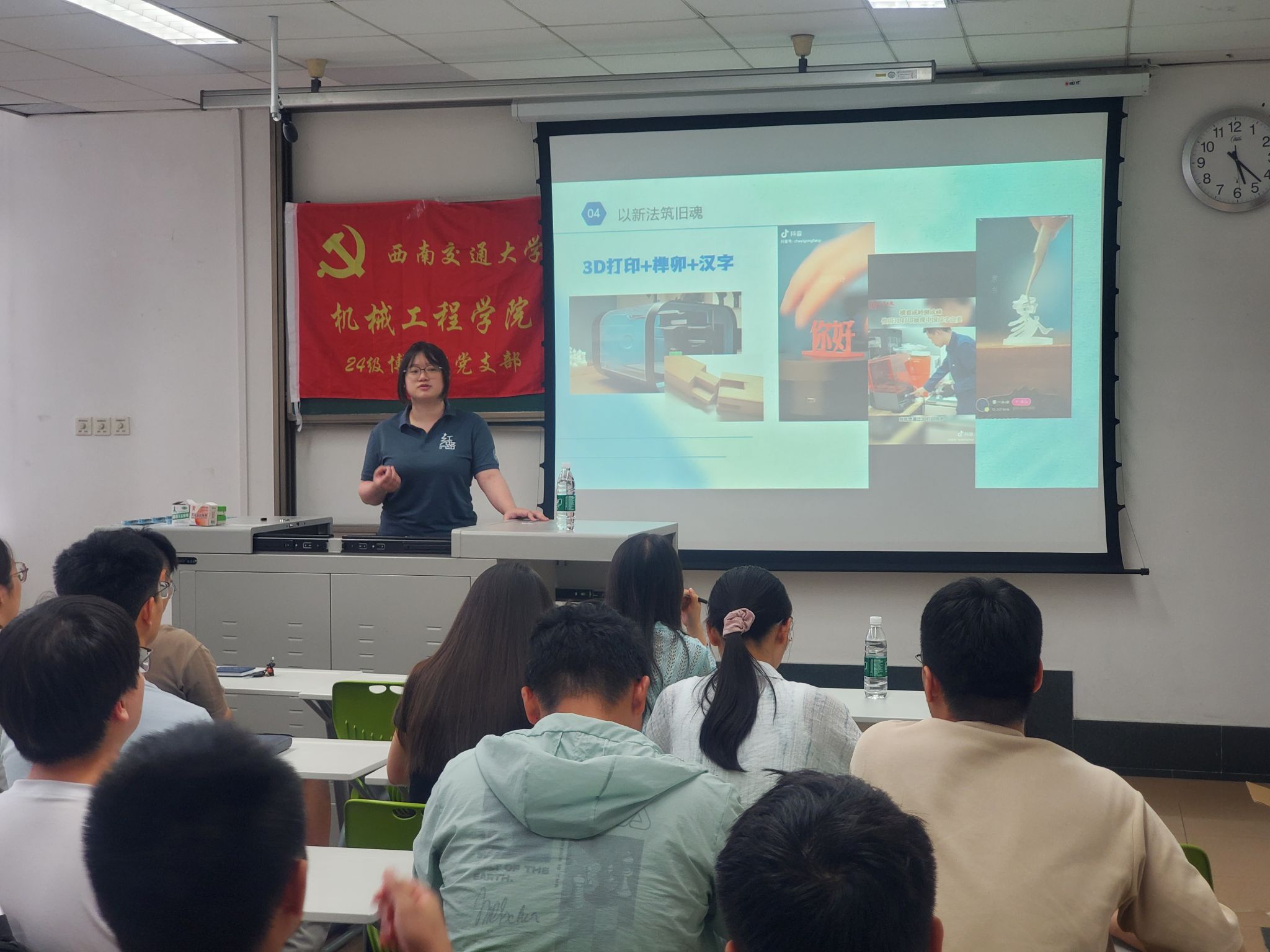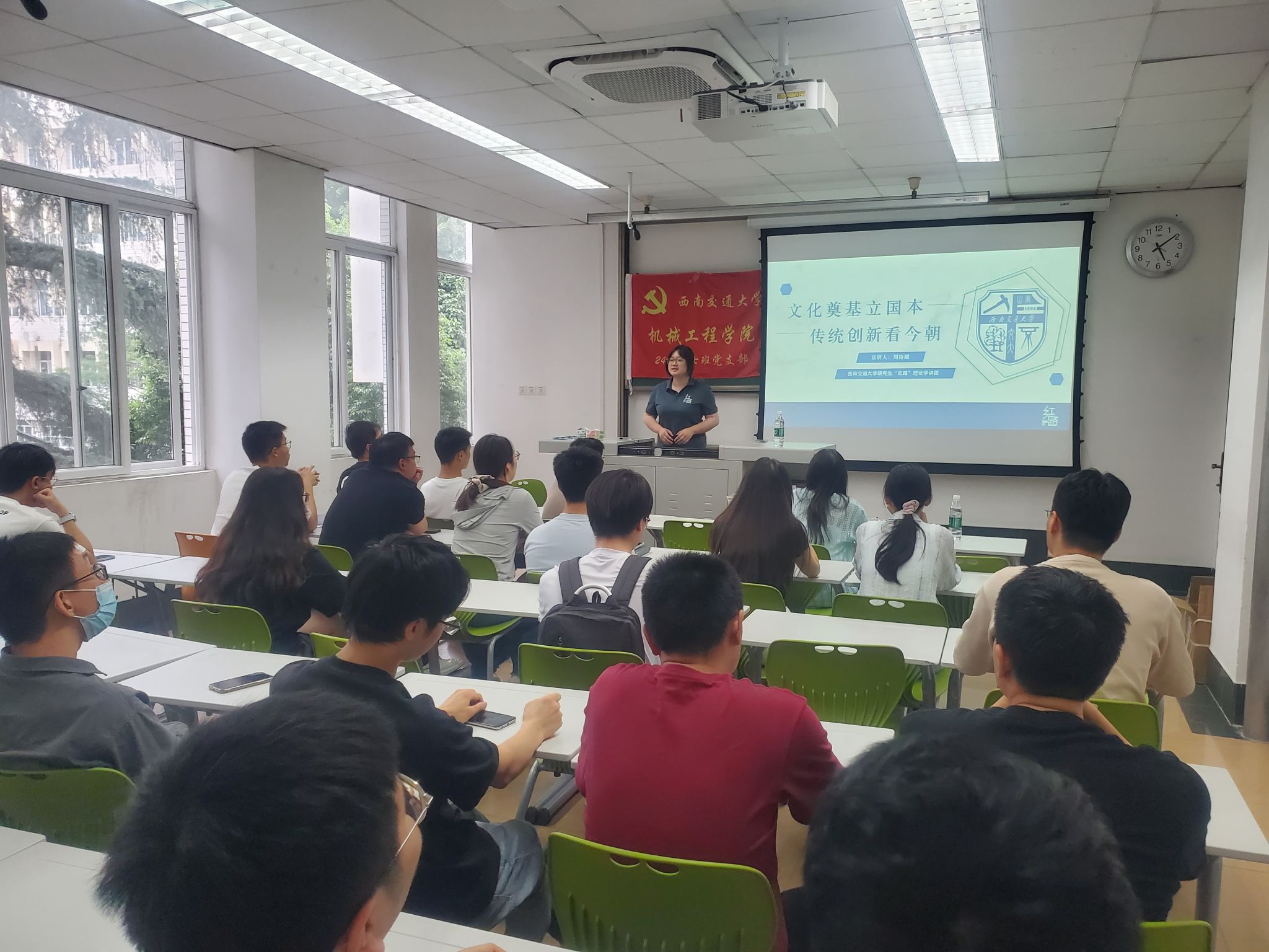 2025年6月20日,西南交通大学研究生“红路”理论学讲团周诗嫣讲师以“文化奠基立国本,传统创新看今朝”为主题,为24级博士班党支部全体成员带来一场思想深邃、案例鲜活的专题分享。活动围绕“以理论造地基、以媒体传非遗、以艺术释精髓、以新法筑旧魂”四大维度展开,引导青年党员在文化传承中坚定自信、勇担使命。周诗嫣讲师以习近平文化思想为指引,结合西南交通大学“红路”学讲团实践成果,系统阐释文化传承的创新路径。