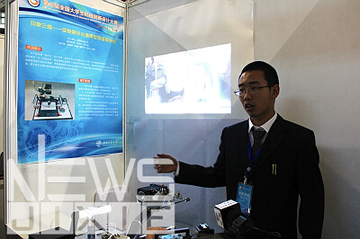 体育馆内,每个展区前都贴着自己小组产品简介的海报,上面包括参赛队员、指导老师、作品内容、创新点、推广价值等内容。专家委员会在各个展区前参观指导,听小组成员对产品的解说和实物演示,并向小组成员提出问题。展区前不时还会有别的学校的指导老师来参观询问,而参赛队员们也毫不吝啬,热情地与老师交流看法。西南交大此次共有15个小组参加今日的小组观摩评比,这15个小组都是通过校赛的多次答辩筛选出来的,每个小组都针对比赛主题教具和教室用品充分发挥了自己的创意。在琳琅满目的作品中,记者特别注意到一个小组,他们是来自西南交通大学机械学院的邱硕、董翰林等同学设计的“印象三维——实物展示台通用型增强模块组”,产品基于普通实物展示台开发,避免了在教室中增加新的展示设备,节约教室空间,吴教授在观看时也给予了很高的评价。