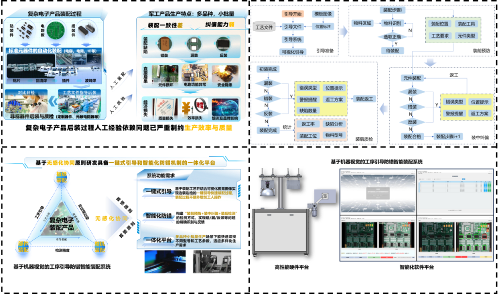 在新工科创新人才培养的背景下,云博电子·(中国)网站持续推进产教融合示范性项目,打造“基础研究-技术攻关-产业应用”的全链条创新生态,“引精智检-复杂装备电子产品装配质检一体化开拓者”是具有标志性意义的阶段化成果,该项目基于复杂电子产品人工后装与对比目检过程中,尤其针对“多品种,小批量”的特殊电子产品的生产,存在装配一致性差和纠偏能力弱以及严重制约生产效率与装配质量的问题,设计了一套基于无感化协同原则研发的具备一键式引导和智能化防错机制的一体化平台,该平台具有一键式引导装配、全过程智能化防错、引导质检一体化的特点,与传统引导方式相比,该项目研发的引导质检一体化平台避免了产品后装质量和效率严重依赖人工经验,是一套装配效率更高、防错机制更优、引导与质检兼具的一体化平台。