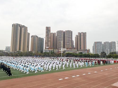 周六上午,犀浦的天气不算太好,体育场周围却比平时还要热闹几分。八点刚过,体育场上各个学院的队伍已经排在了指引牌的后面。每一支队伍的成员都穿着不同的太极服,白色、黄色、红色和黑色,在阴天下依然是挡不住的活力。