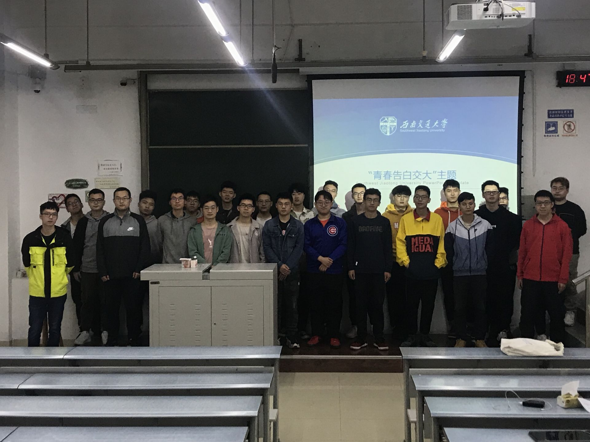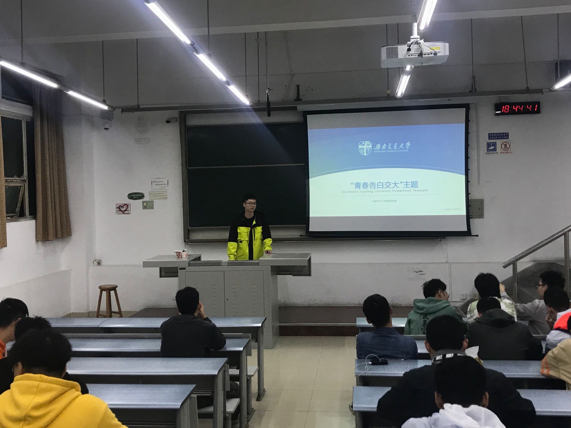 活动于晚上7点开始,参加活动人数31人,组织进行签到记录。团支部书记杨文昊首先致开场词,强调了在新中国成立71周年与建党一百周年的重要时刻的背景下,作为新时代新青年的我们要始终牢记中华民族伟大复兴的伟大使命,要理解习近平总书记在党的十九大报告中指出的“青年兴则国家兴,青年强则国家强。青年一代有理想、有本领、有担当,国家就有前途,民族就有希望。中国梦是历史的、现实的,也是未来的;是我们这一代的,更是青年一代的。中华民族伟大复兴的中国梦终将在一代代青年的接力奋斗中变成现实。”的深刻含义。在这里程碑的时刻,我们青年要不断地充实自己,而交大就是在不断地为祖国培养出色的青年人才,为新中国的交通事业作出了巨大的贡献,我们作为交大学子借此机会为交大告白。开场词后,班长同晓阳带领大家重温了交大历史,从1896年到今天,学校经过多次搬迁,成为了如今的西南交通大学,学校的历史是悠久的,是伟大的,竢实扬华的交大精神没有被遗失,而是深深地刻在了每一个交大人的心中。同时,同晓阳也为我们介绍了杰出的西南交大校友与毕业学长学姐的优秀事迹,鼓励车辆5班的各位同学在毕业季到来之时,也能很好地为自己的未来做好打算,以后也能成为对社会有贡献的人。班长致辞完毕后,全班同学对交大各自进行了讨论与告白,其中孙建同学上台为大家介绍了交大在科研领域的重大成就,期望大家以后也能在机械等领域有着自己的一番作为,成为一名合格的交大人、机械人。