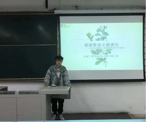 车辆2017-02班班长蒋吉鑫作为主讲人组织学习宣传教育,以“防治艾滋病、结核病等重大传染病”为主题开展健康教育,提高学生相关知识知晓率,增强同学们预防传染病的意识和能力,树立正确的生命观、道德观和社会责任意识,采取主题讲解以及动漫视频讲解等方式对本次班会主要内容进行了详细的说明,之后邀请同学们对该部分进行深入讨论并分享感悟。