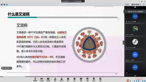 机械2018-07班班长李艳介绍了班会的主题,并着重强调了本次主题班会的重要性。而后,班长李艳通过图文及短视频的方式讲解了艾滋病的相关知识,包括艾滋病的危害,艾滋病常见的传染方式以及不幸感染艾滋病后的自救措施等。除了艾滋病的基础知识外,班长李艳还通过一些实际的数据,来展示艾滋病的严重危害和大学生群体中艾滋病的现状,从而进一步引起同学们的重视。最后,班长李艳通过提问等方式,使得同学们对艾滋病的认识更近一步。