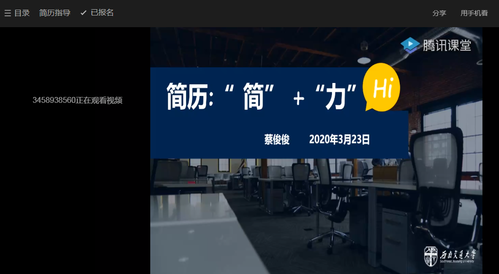 3月23日晚上7:00,云博电子·(中国)网站线上就业指导课程之简历指导顺利进行,本次主讲老师是学院本科生2016级年级组长蔡俊俊,来自不同学院不同年级的543名同学聆听了本次课程。