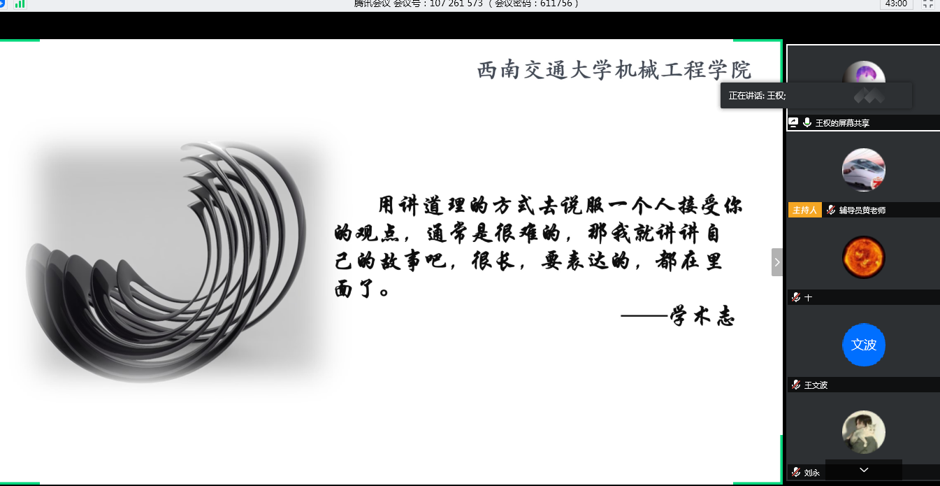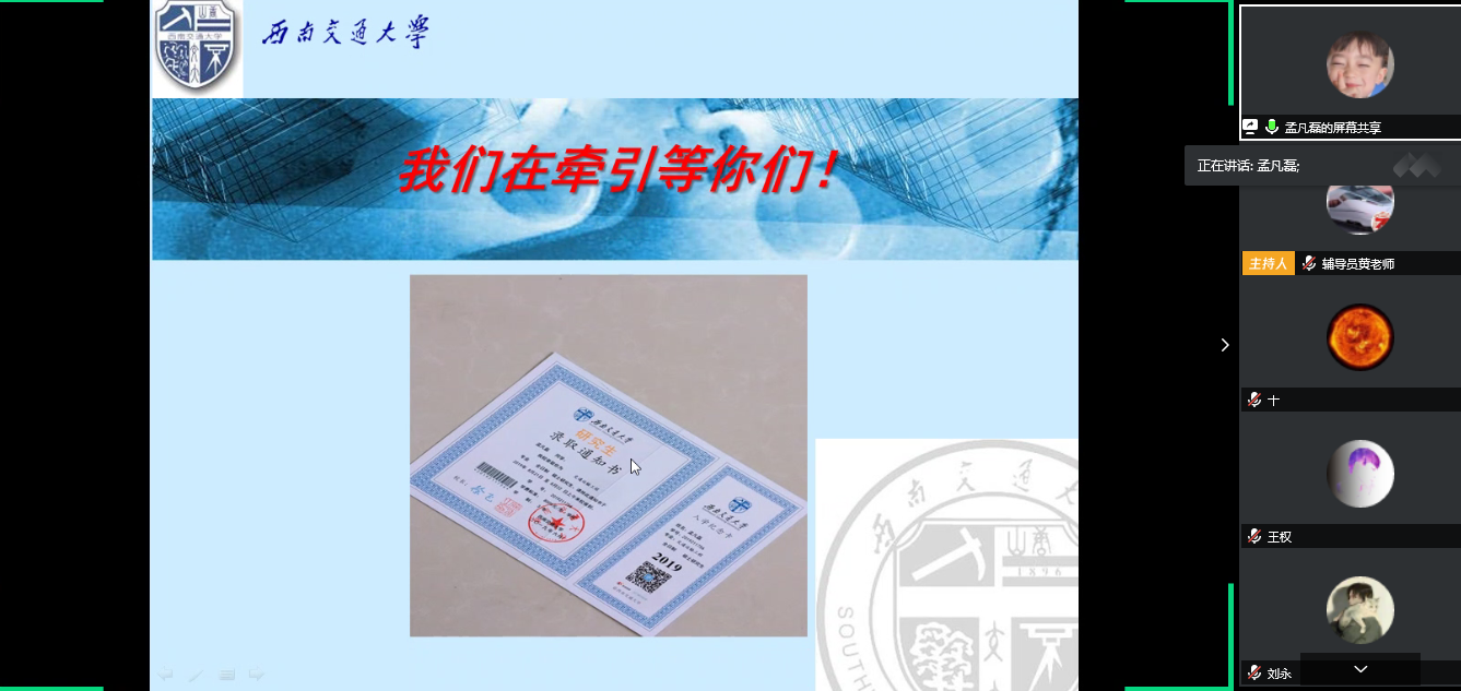 为应对新冠肺炎疫情对毕业生就业工作的影响,贯彻落实教育部和学校关于做好就业指导的相关要求,实施精准指导,4月21日下午2:00,来自机械学院和牵引动力国家重点实验室的不同专业的13名同学为即将参加2020年考研复试的毕业生同学分享了自己往年的复试经验,机械学院就业指导老师黄兆国主持了本次活动。