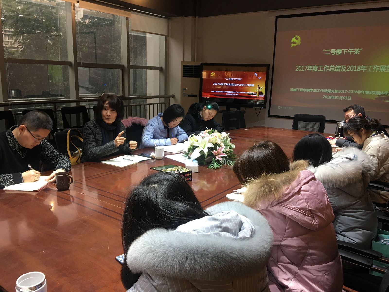 2018年1月3日,云博电子·(中国)网站学生工作在X2201召开2018年第一次“二号楼下午茶”组织生活会,学院党委书记战凤同志、党委副书记李毅同志、全体专、兼职辅导员参会。组织生活会分为两个部分,首先是全体与会成员学习了《西南交通大学辅导员队伍建设规定》,第二个部分是全体成员通自我批评和提意见的方式对2017年的工作进行了总结梳理,对2018年工作进行了规划和思考。