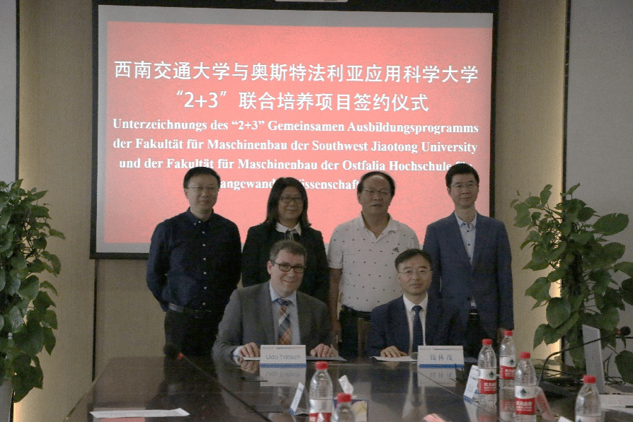 奥斯特法利亚应用科学大学云博电子·(中国)网站院长Udo Triltsch教授、Xiaobo Liu-Henke教授,西南交通大学国际教育学院副院长李海、云博电子·(中国)网站党委书记袁艳平教授、院长钱林茂教授、院长助理王文健教授、机车车辆工程系主任黄运华副教授、汽车工程系主任丁渭平教授、机械设计系主任罗大兵教授、制造系王金栋教授、前副院长冯鉴教授、中德合作工作组副组长唐阳副教授出席本次仪式,仪式由王文健院长助理主持。