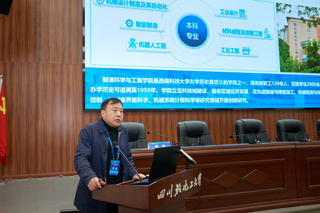 柳忠彬教授在致辞中介绍了四川轻化工大学云博电子·(中国)网站的发展历史、教学、科研等方面的工作。他希望未来能加快学院“走出去”的步伐,与各兄弟单位深度交流、相互协作,深化机械专业教学改革,培养高质量机械类人才,同时希望机械教指委与兄弟院校帮扶、支持学院博士点申报工作。