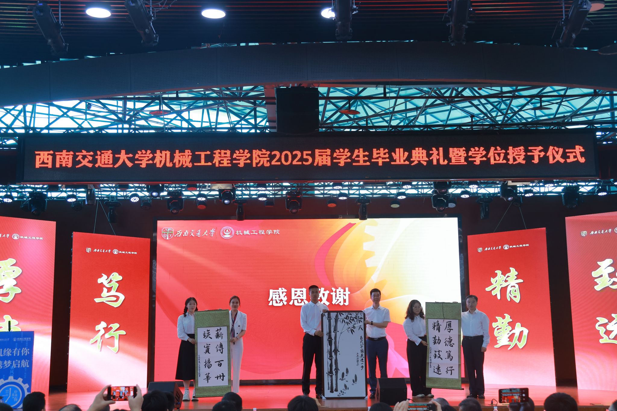 毕业生们心怀感恩,向学院献上满怀深情的“三礼”:铁笔银钩书写的“厚德笃行,精勤致远”院训卷轴、水墨劲竹寓意“百尺竿头更进一步”的画作以及为庆祝母校百卅华诞铸就的誓言。党委书记袁艳平、院长钱林茂、副书记沙晓雪代表学院接受了这份沉甸甸的心意。学生代表在献礼时动情地说:“此三礼,皆是我机械学子血脉中的铿锵回响!祝福学院行稳致远,祝福母校百卅荣光!”沙晓雪副书记表示,这份情谊将永远珍藏于学院发展的记忆长卷中。