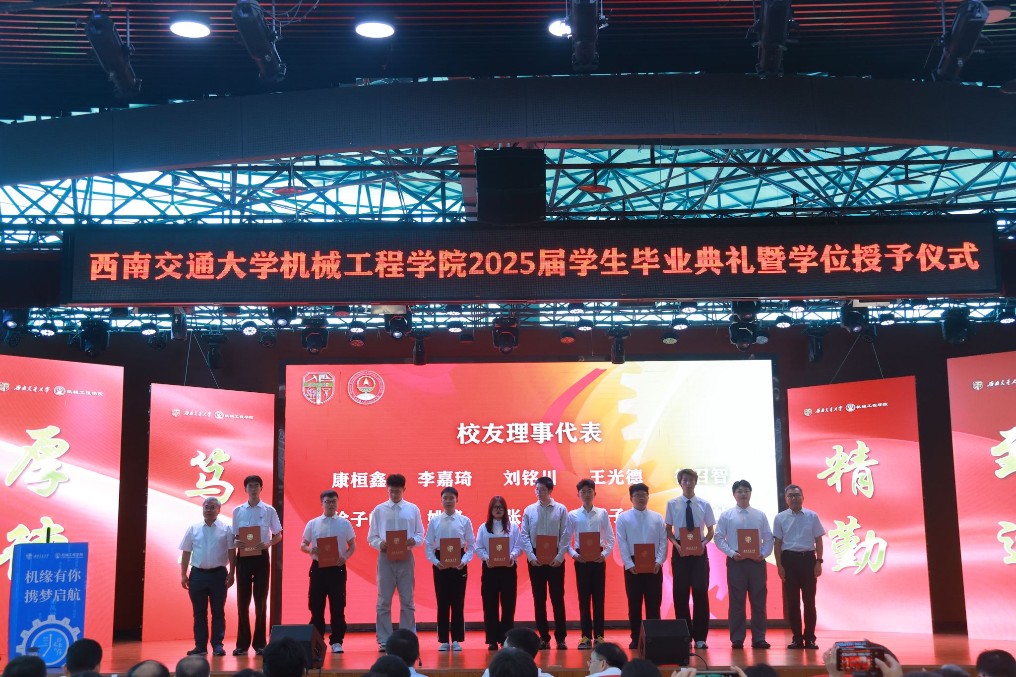 典礼上举行了2025届校友理事聘任仪式。吴子杨等33位2025届本研毕业生担任年级、班级校友理事,副院长丁国富、王文健为校友理事代表颁发了聘书。这份责任象征着从“同学”到“校友”的身份转变,也承载着学院与毕业生之间永恒的联结。