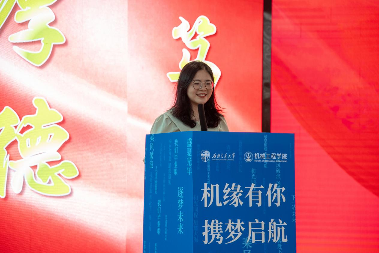 学子心声诉深情,家校共育感师恩博士毕业生代表孙瑞雪、本科毕业生代表朱艾新同学先后发言。他们深情回顾了在学院求学的点滴成长与收获,表达了对母校、学院、师长和同窗的无限感激与不舍,并分享了在学习科研、竞赛实践中的难忘经历,展现了机械学子的风采与担当。他们表示将带着“竢实扬华,自强不息”的交大精神,在未来的道路上砥砺前行。