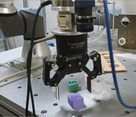 执行器方面,采用UR3机器人,以及robotiq夹爪作为执行机构,实现工件的抓取并将之装配到对应的孔中。Robotiq夹爪内置了力传感设备,能够控制夹取的力,确保机械臂能够抓紧物体。编写了控制代码完成整个过程。