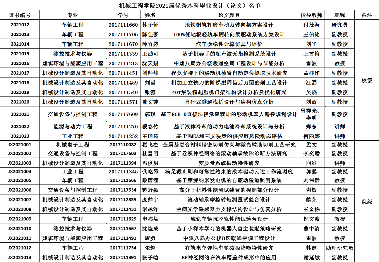根据《西南交通大学本科毕业设计(论文)管理办法》、《机械工程学院本科毕业设计(论文)管理办法》的相关要求,为加强对本科生毕业设计(论文)的全过程管理,展示学院优秀本科毕业设计(论文)成果,树立榜样、表彰优秀。经系所推荐、学院组织评审、学校终审,现推荐12篇校级优秀本科毕业设计(论文)、13篇院级优秀本科毕业设计(论文),评选结果公布如下:
