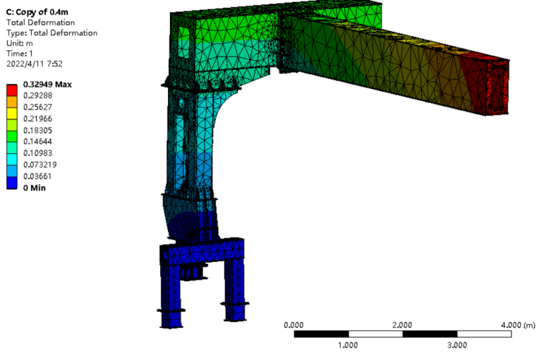 在进行毕业设计的过程中,也遇到了一些问题。在进行结构的设计与计算的时候,由于衬砌台车门架结构与一般门式起重机有所不同,不能完全套用门式起重机计算公式,在进行主梁和支腿计算时存在一定的问题。而且由于计算的复杂,对于取得正确结果来说需要花费更多的时间。在进行有限元分析时,由于门架是对称结构,最开始并没有想到可以用对称结构来处理,导致浪费了时间。后面进行处理时,取其中四分之一的结构,在其上施加约束与载荷,这才大大节省了软件处理的速度。这些问题通过自己的努力,以及老师和同学帮助,也都得到了很好的解决。