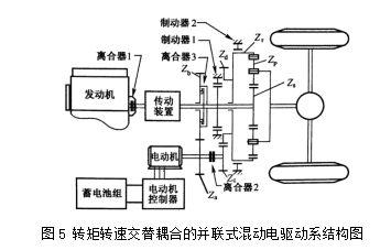 在本课题设计中,选用转矩和转速交替耦合的结构作为机械耦合装置,具体的电驱动系结构如下图5所示,根据不同的运行工况,通过设定合理的能量分配控制策略来选择转矩耦合或者转速耦合。