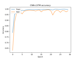 由上表可以看出,本文提出的CNN-LSTM模型比CNN模型和LSTM模型在凯斯西储大学数据集各类工况下滚动轴承故障诊断的精度都高,同时每个训练周期所耗时间最短,效率最高。下面将CNN-LSTM模型可视化: