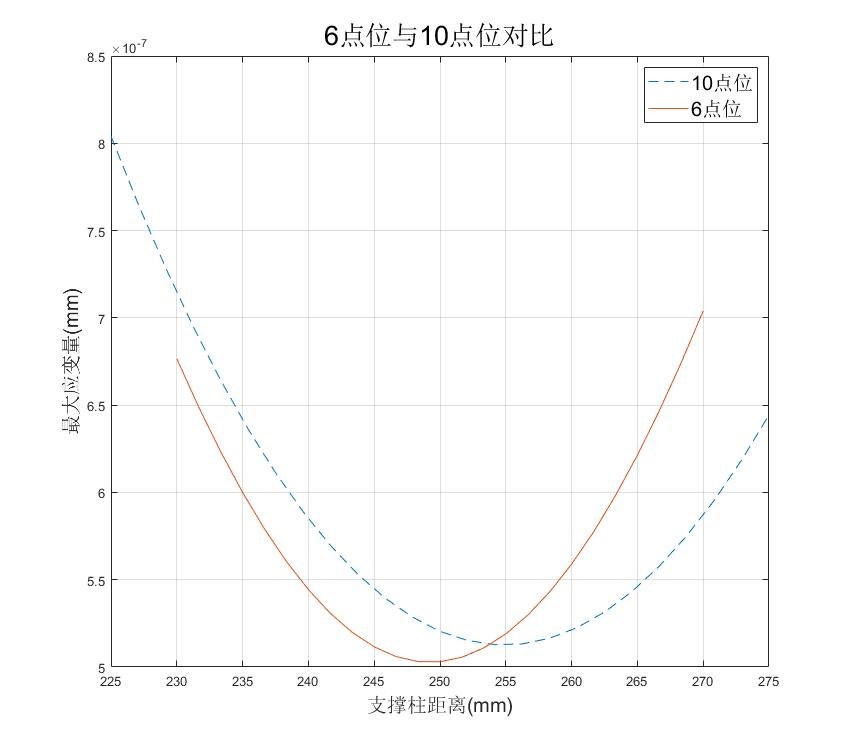 回答我比较了6点位方案与10点位方案的支撑柱直径与最大应变量两个参数之间的关系,从图中可以直观的看出10点位在相同支撑柱直径下,镜面的最大应变量远小于6点位的设计。我还比较了支撑柱到镜面圆心的距离与最大应变量的关系,发现6点位在距离为250mm左右时最大应变量有最小值,而10点位在距离为255mm时最大应变量有最小值。