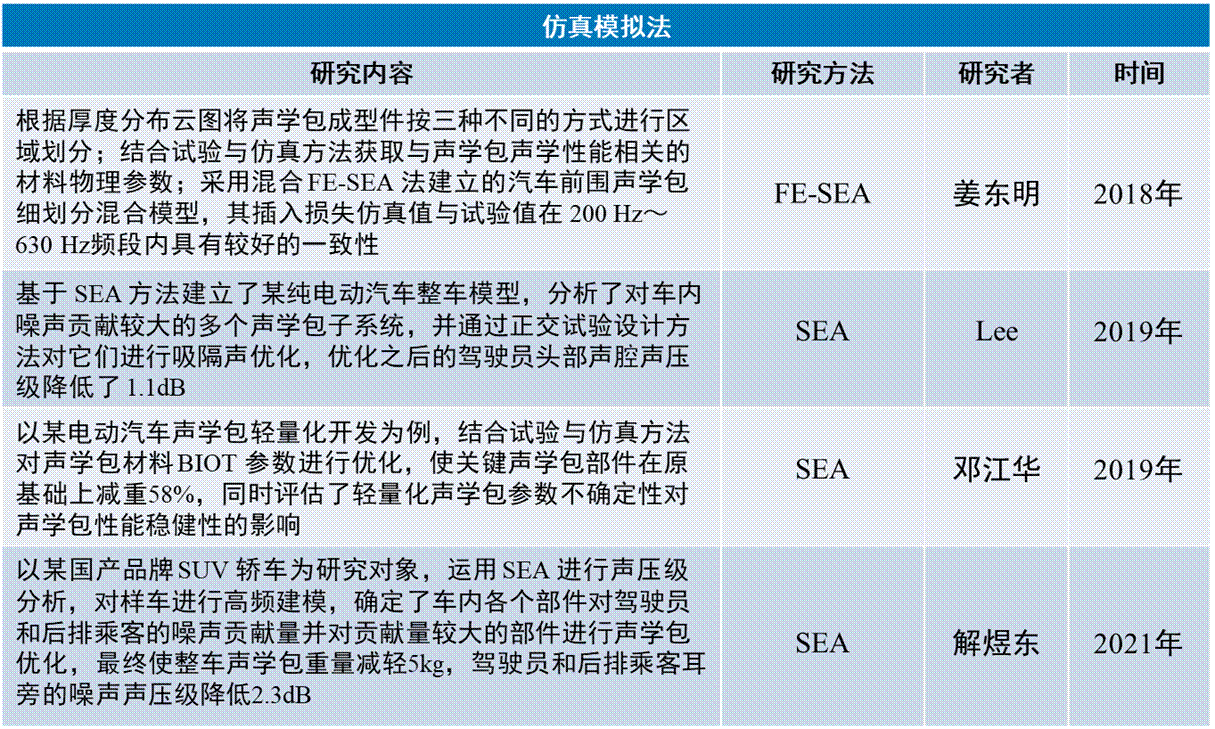 随着汽车技术的进步和生活水平的提高,人们更加关注汽车的乘坐舒适性,因此乘坐舒适性中的振动与噪声性能常常作为评价汽车品质的关键因素。汽车声学包是指具有降低车内声压尤其是空气声声压的声学部件组合,是降低噪声水平的主要手段之一,对车内声学特征分布具有重要的影响,一直以来就在汽车行业广泛使用。好的声学包设计,不仅能够提升车内声学品质,而且能够促进车辆轻量化与降低成本。