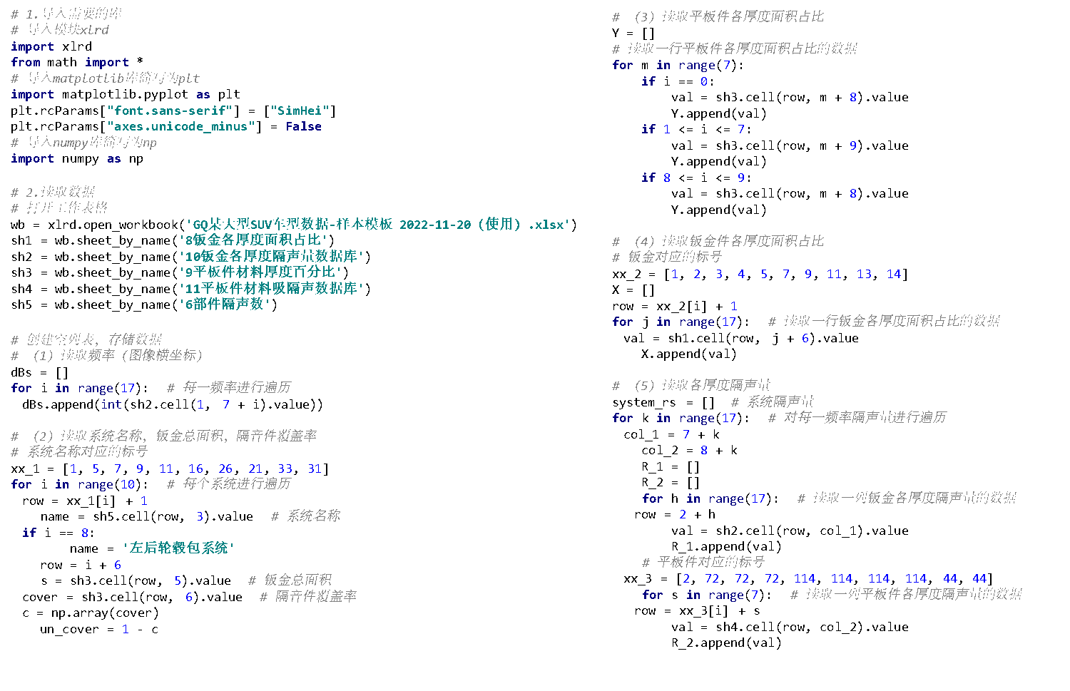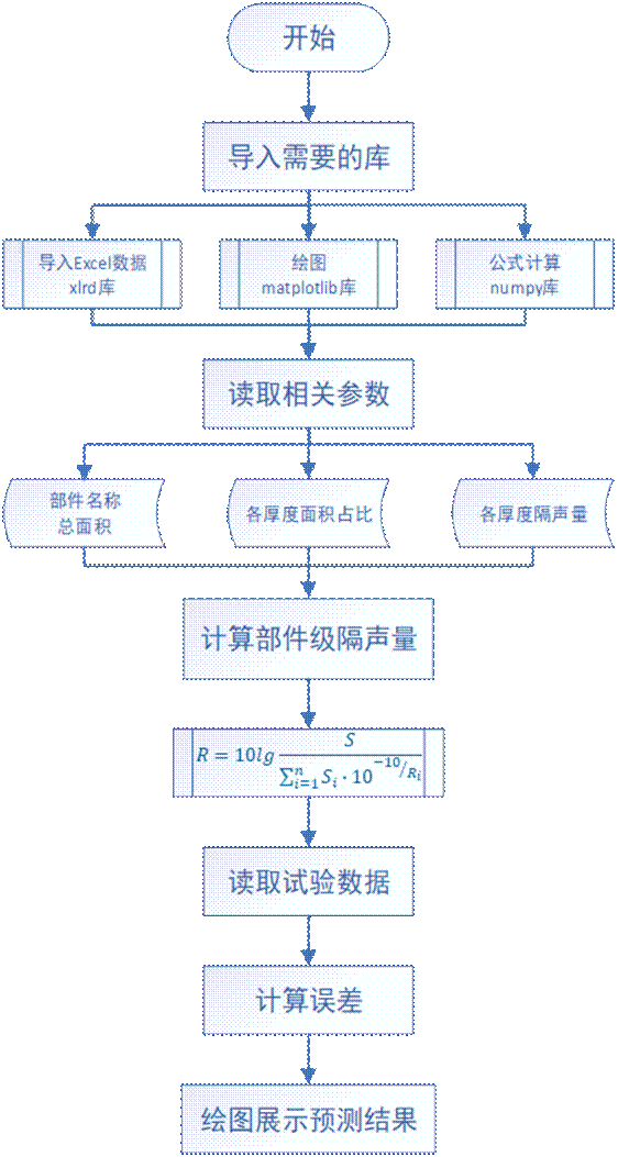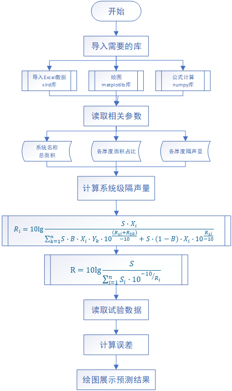 学习Python编程语言,根据组合吸隔声理论公式,拟定程序框图,编写相关算法。利用Python读取数据库中相关参数,计算吸隔声量,建立预测模型。
