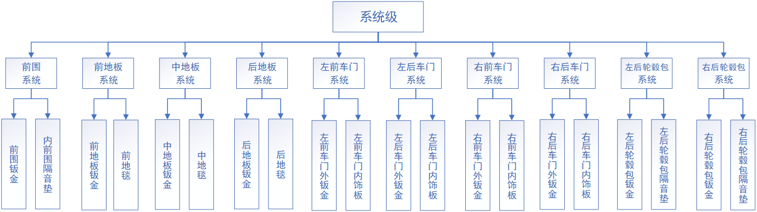 基于组合吸隔声理论公式及声学包数据库,将声学包部件级、系统级进行分类,共10个系统、20个部件(含10个钣金件、10个平板件)。