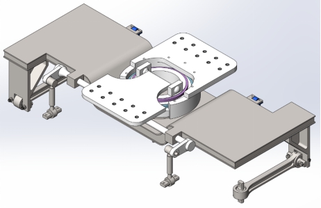 转盘式铰接装置的铰接转向功能主要由转盘轴承实现,转盘轴承分为外圈、中圈和内圈,其中中圈固定,和摇枕固接,外圈和内圈轴承可与中圈转动。此外外圈和内圈分别通过各自的连接臂连接两节车体。内圈连接臂和内圈轴承之间通过橡胶堆连接,可以允许一定程度扭转。