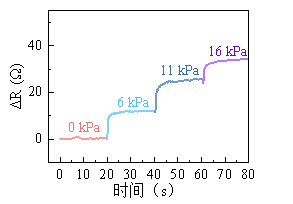 首先对不同刻蚀参数下的压力传感器的压敏曲线进行测试,结果表示,不同的激光刻蚀参数下,压力传感器的灵敏度和传感范围也不同。如图15所示,LIG压力传感器的灵敏度范围为0.03~0.24 kPa-1,传感范围为20~60 kPa(S > 0.002 kPa-1),电阻变化率最高可达到94 %。随着相对激光能量的升高,压力传感器灵敏度先升高(0.71~0.86 J),而后逐步降低(0.86~1.17 J),这或许是由LIG中不同级别的结构起主导作用引起的。