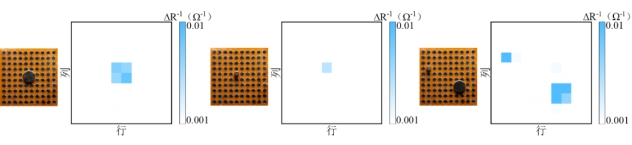 为测试压感阵列的空间精度,我们在传感器阵列上分别放置了5 mm直径和2 mm直径的圆型磁铁。如图18所示,压感阵列能够准确分辨出磁铁的大小和位置,具有低至2 mm的空间精度。
