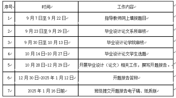 开题报告检查与答辩时间:采用各教研室普查,学院抽查的方式进行,学院抽查名单在12月公布,各系所2024年12月30日—2025年1月12日安排开题报告答辩,具体答辩信息另行通知。