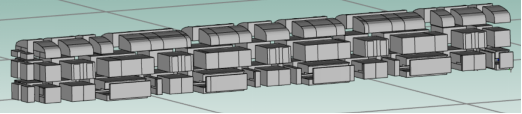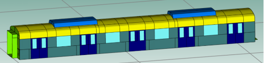 根据地铁车体结构,将地铁列车划分为地板、侧墙、圆顶、客室门、客室窗以及贯通道这六个子系统。各部件在SEA模型中简化为平板或曲板结构。车内声腔在纵向上划分为11个腔体。下图分别为车体板件结构、车内声腔子系统、车内声腔爆炸图以及声腔与结构的SEA连接系统的整车模型。