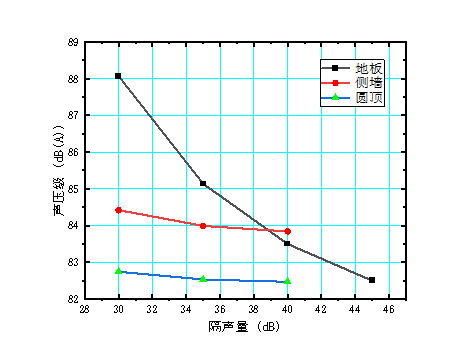 对各部件(地板、侧墙、圆顶等)隔声量灵敏度分析,研究各部件随隔声量变化对车内噪声的影响,结合地铁噪声来源,最终确定地板为研究对象。根据仿真数据,优化地板原始隔声方案,将地板隔声量提高5dB。