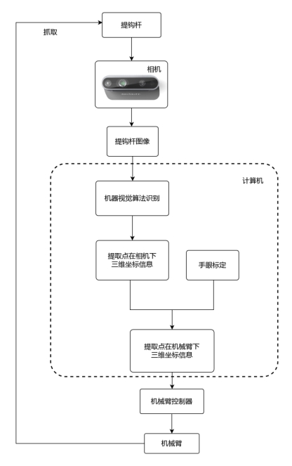 (3)对选择的相机进行相机标定,从而获取相机的内参和外参,为下一步的手眼标定提供相机参数;对相机和执行摘钩操作的机械臂进行手眼标定,确定二者的相对位置,确保视觉信息与机械臂操作具有一致性。