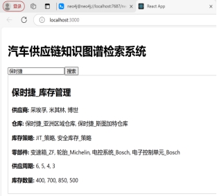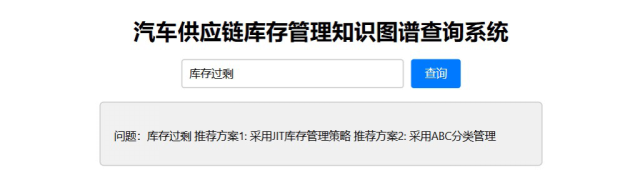 (5)检索系统构建:基于知识图谱开发简单的检索功能,如库存知识查询功能,企业用户可以通过输入关键词查询相关库存管理知识,如特定零部件的库存控制策略、某种情况下的库存成本计算方法等。选取汽车企业的实际库存管理场景进行案例应用,验证知识图谱在实际中的应用价值,帮助汽车供应链上各节点企业实现知识共享。同时在检索系统中输入相应的库存问题企业用户可查询到相关的库存解决方案。