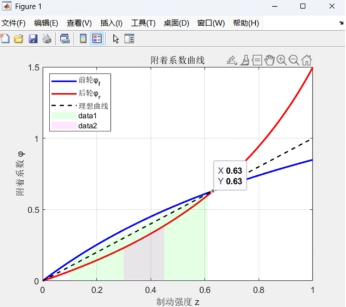 4.针对制动比与同步附着系数编写matlab程序生成附着系数曲线。