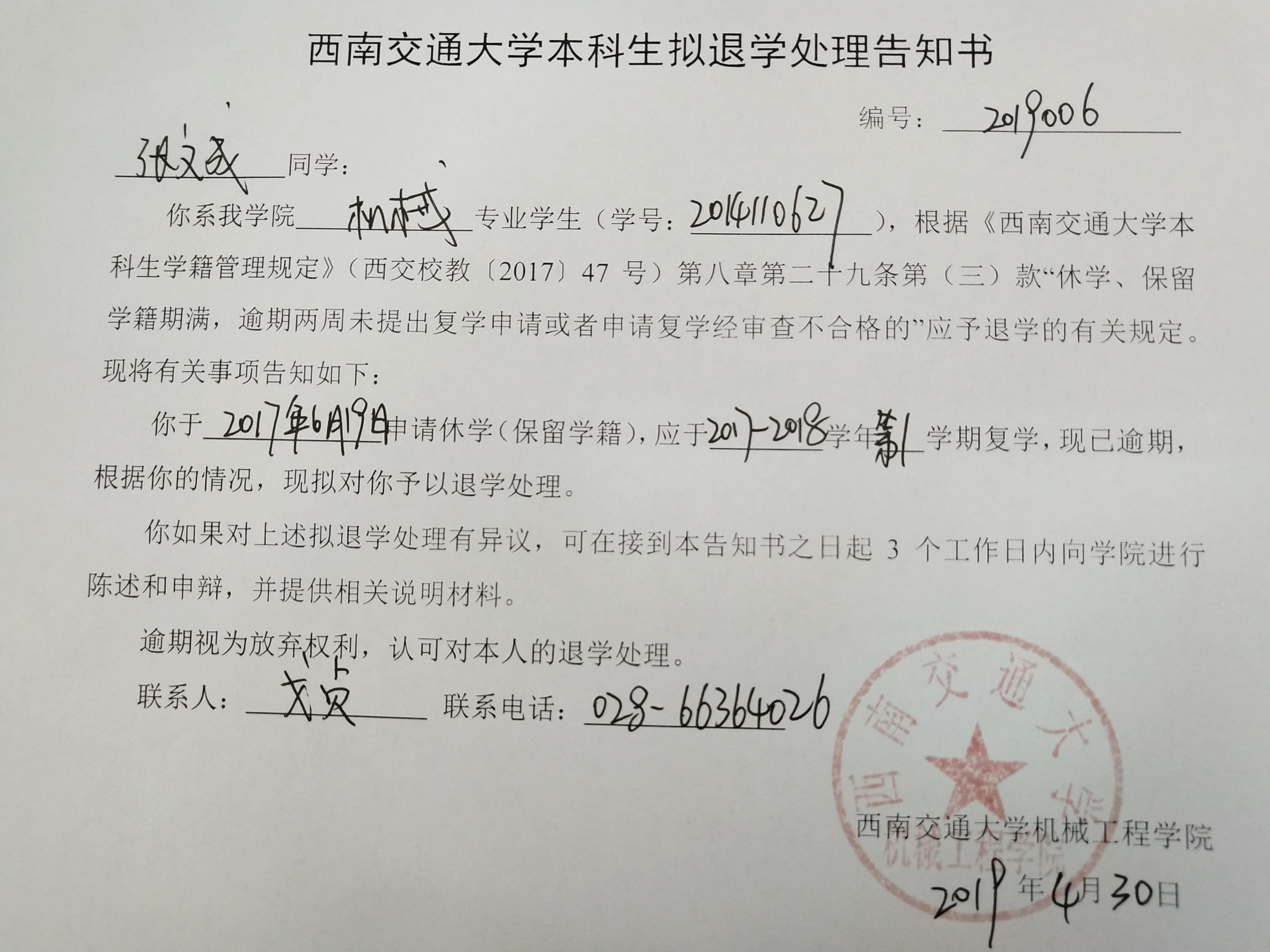 关于拟对李松锐、张文成2名同学作出退学处理的告知书